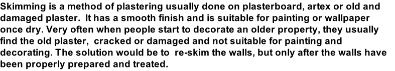 Office 0207 504 1235 Call Free 0800 061 2208 From Repairs to Complete houses SKIMMING PATCHING & REPAIRS DRY LINING We are able to do wet plastering, dot and dabbing and float and set. We can transform your room into a perfect condition using plastering  methods that will suit the style of room or house. We have the expertise to offer a quality job at affordable prices RENDERING